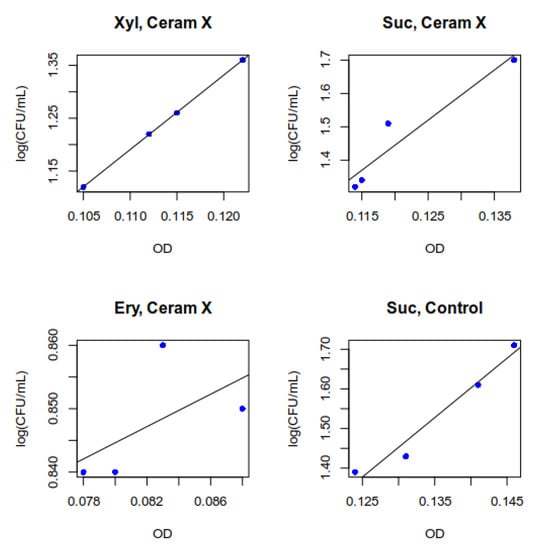 Examples of linear regression curves for four selected biofilms developed under influence of Xyl (xylitol), Suc (sucrose), and Ery (erythritol). High degree of dependence indicates that biomass increase is proportional to the increase in the number of viable S. mutans cells in the biofilm.
