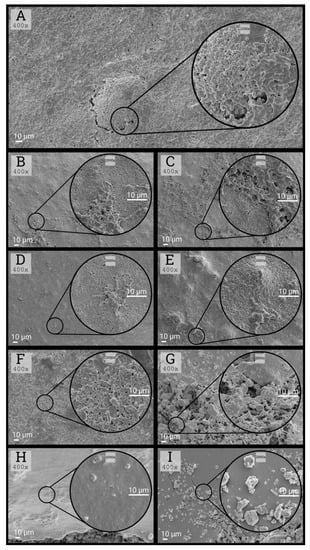 A stronger inhibitory effect on S. mutans was observed in the case of glass ionomers compared to composites, as shown in the images from the scanning electron microscope (Figure 5B–I). Erythritol was characterized by the best inhibitory properties among the tested sweeteners, which confirms the results obtained in bacterial biofilm culture. An example of the micromorphology of biofilms formed on a composite material under the influence of the studied polyols is shown in Figure 5B–E), while biofilms formed on a glass ionomer with the use of sweeteners are shown in Figure 5F–I.