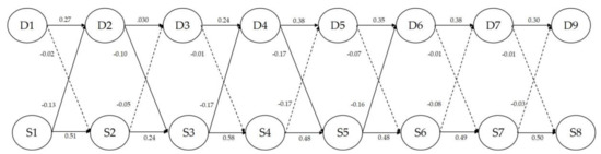 The longitudinal relationship between depression and self-esteem. D1 = Depression 1st, D2 = Depression 2nd, D3 = Depression 3rd, D4 = Depression 4th, D5 = Depression 6th, D7 = Depression 7th, D8 = Depression 8th, S1 = Self-esteem 1st, S2 = Self-esteem 2nd, S3 = Self-esteem 3rd, S4 = Self-esteem 4th, S5 = Self-esteem 6th, S7 = Self-esteem 7th, S8 = Self-esteem 8th, ―> Significantly, ∙∙∙∙∙> Non-Significantly