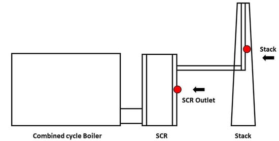 Additional NH3 sampling at one of the power plants was concurrently carried out at the SCR outlet to analyze the differences in NH3 emission sources, with the purpose of potential inventory improvement. Air pollution prevention facilities installed only SCRs, which are NOx reduction facilities, at both LNG plants A and B. The approximate sampling location and related schematic diagram are shown in Figure 1.
