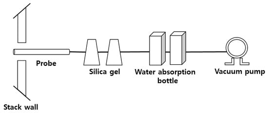 To measure the NH3 concentration at an LNG power plant, the indophenol method suggested in the odor and air process test methods was used. The indophenol method quantifies NH3 concentrations based on the absorbance of indophenols generated during the reaction with NH4+ ions in the analytic sample upon addition of sodium hypochlorite and phenol-sodium nitroprusside solutions. For NH3 sampling, an NH3 absorbent (50 mL boric acid solution) was placed in two 50 mL flasks and exhaust gas was added using a minipump at a rate of 4 L/min for 20 min, for a total of 80 L. To remove the moisture from the exhaust gas, a bottle containing silica gel was placed at the entrance of the NH3 sampling device. Figure 2 shows a schematic diagram of the NH3 sampling process. After NH3 collection, the outside diameter of the absorbent was measured at 640 nm using a spectrophotometer. NH3 sampling was performed at the power plant stack and the SCR outlet for power plant A and only at the stack for power plant B.