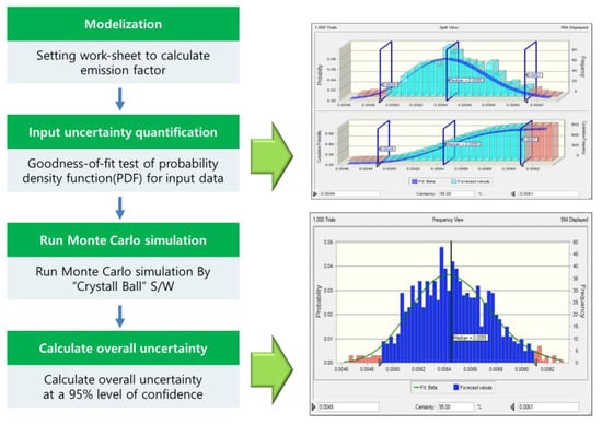 The Monte Carlo simulation was utilized to estimate the uncertainty of the NH3 emission factor. This method evaluates the uncertainty by generating random numbers and assigning a probability density function (PDF) to each variable [13,14]. The Intergovernmental Panel on Climate Change (IPCC) recommends the Monte Carlo simulation as a Tier 2 method of estimating the uncertainty of greenhouse gas (GHG) emission factors. As shown in Figure 3, the analysis based on the Monte Carlo simulation involves four steps. The first step selects the appropriate model and composes the NH3 emission factor estimate work sheet. In the second step, the PDF conformance of the input variable required for development of the NH3 emission factor is tested. The significance level for the hypothesis testing was set to 5%. In addition, based on the conformance tests of the NH3 emission concentration, the PDF of the emission flow rate and fuel consumption (which are necessary to determine the NH3 emission factor) are estimated. The Monte Carlo simulation is performed in step three, where Crystal Ball is used for random sampling simulation. In step four, the uncertainty range is estimated based on the simulated results at a 95% confidence interval.