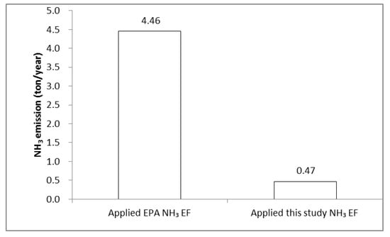 The emission factor for the LNG stack developed in this study and the EPA emission factor applied in conventional statistics in Korea were applied (fuel consumption of Korean LNG power plants in 2016: 87,395,623 Nm3/year), and the differences in the NH3 emission levels for LNG power plants were compared. The results of this comparison are presented in Figure 4.