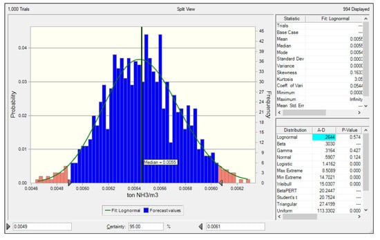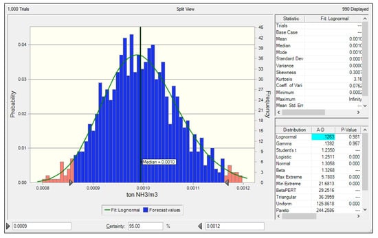 The Monte Carlo simulation was used to estimate the uncertainty of the NH3 emission factor for LNG power plants developed in this study, and the results are presented in Figure 5 and Figure 6. The PDF of the NH3 emission factor for the LNG power plant stack developed in this study indicated a lognormal distribution. The median was 0.0055 ton NH3/106Nm3 at a 95% confidence level, the lower 2.5% was 0.0049 ton NH3/106Nm3, and the upper 97.5% was 0.0061 ton NH3/106Nm3. Using these values, the estimated uncertainty range of the NH3 emission factor was ±10.91% at a 95% confidence level.