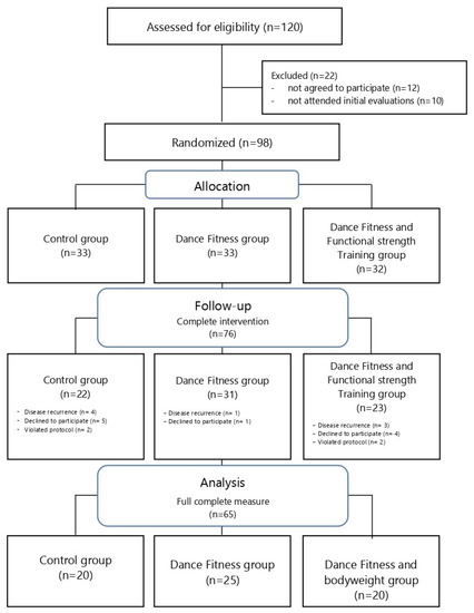 Inclusion criteria were apparently healthy inactive adult women (from 25 to 50 years old, and less than 150 min of physical activity per week), and university workers with mainly sedentary tasks in her job occupation (sitting for more than 6 h a day). Women with a serious illness diagnosed, such as cancer, stroke, or severe muscular illness were excluded from the study. Participants were invited to the study by email requests from university corporative accounts (approx. 948 university women workers). A total of 150 interested women responded to the email invitation and 148 attended the initial study meeting. Finally, 120 participants accomplished the inclusion criteria and 108 agreed to participate in the study, but only 98 attended the initial evaluation. These 98 participants were randomly assigned to the study groups. The randomization process was done by a member of university staff who was not part of the research team. One academic staff extracted one by one ballots from a central box (each ballot belonged to a code assigned to a participant) and distributed it always from right to left into 3 boxes (each assigned to a study group). Neither this person nor the team of researchers knew which box was assigned to each study group or which code belonged to each participant. After the evaluation, 76 participants concluded the intervention period, and 65 were analyzed for this study since they fully completed the study measurement instrument (Figure 1).