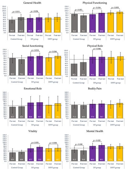 After intervention, the control group statistically differed from both exercise groups in Physical Functioning (Control group versus DF group: MD = −14.43 ± 2.48, p < 0.001; Control group versus DFFT group: MD = −13.85 ± 2.6, p < 0.001), and Physical Role (Control group versus DF group: MD = −12.94 ± 4.20, p = 0.010; Control group versus DFFT group: MD = −11.51 ± 4.380, p = 0.034) showing lower punctuation. Statistical differences were also observed between the control group and DF group in the Social Functioning and Mental Health dimensions, where the control group presented lower punctuation (MD = −12.95 ± 4.80, p = 0.029 and MD = −22.411 ± 5.34, p < 0.001, respectively). All study groups differed in Vitality dimension (Control group versus DF group: MD = −22.06 ± 3.74, p < 0.001; Control group versus DFFT group: MD = −12.78 ± 4.12, p = 0.009), and DFFT group versus DF group: MD = −22.41 ± 5.4, p < 0.001) where the DF group reached the highest score. No statistical differences were observed between groups post-intervention for General Health, Emotional Role, and Bodily Pain.