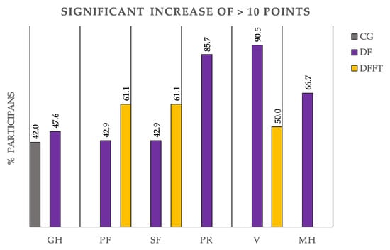 Changes in HRQoL dimensions from baseline to post-intervention within the groups are presented in Figure 2. In brief, six out of eight HRQoL dimensions significantly improved at the post-intervention in the DF group, whereas three of eight dimensions significantly improved in the DFFT group, as well as in DF group. The HRQoL mainly remained with no post-intervention changes for the control group, which presented detriments in some HRQoL dimensions. The general health dimension significantly improved in the DF group and Control group (MD = 7.7 ± 3.6, p = 0.036; MD = 9.6 ± 3.6, p = 0.011, respectively), whereas improvements without significant changes were observed in the DFFT group. Physical Functioning, Social Functioning and Vitality significantly improved in both exercise intervention groups (DF group: MD = 6.2 ± 1.8, p = 0.001, and DFFT group: MD = 5.7 ± 1.9, p = 0.005; DF group: MD = 8.8 ± 3.4, p = 0.014 and DFFT group: MD = 7.3 ± 3.5, p = 0.044; DF group: MD = 17.6 ± 2.4, p < 0.001; DFFT group: MD = 8.3 ± 2.7, p = 0.004, respectively). The DF group also presented a positive increase in Physical Role (MD = 13.9 ± 5.9, p = 0.022) and Mental Health (MD = 14.2 ± 3.4, p < 0.0001). The control group showed significant detriments in the Physical Functioning and Mental health dimensions (MD = 8.2 ± 1.7, p < 0.000 and MD = 8.2 ± 3.8, p = 0.033). The percentage of participants within the study groups with score improvements of more than 10 points is presented in Figure 3. The DF group has the greatest percentage of participants with significant increments of more than 10 points (high improvements). Concretely, the majority of the participants of the DF group presented high improvements in three of the six dimensions in which presented significant changes after the intervention: Vitality (90.5%), Physical Role (85.7%), and Mental Health (66.7%). Less than 50% of the participants reached high improvements compared with the baseline values in the HRQoL dimensions of General Health (47.6%), Physical functioning (42.9%) and Social Functioning (42.9%). Moreover, the DFFT group showed high improvements in 61.1% of participants for Physical and Social Functioning, as well as, in 50.0% of the participants for the Vitality dimension. The control group only presented significant-high improvements in the 42.0% of the participants for the General Health dimension.