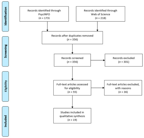 The literature review was performed as indicated in Figure 1 [22]. Over 390 sources resulted from the initial search. Of these, a great number were filtered out based on the following criteria: (i) duplicates, (ii) meeting and conference abstracts and non-empirical studies (e.g., case studies, anecdotal studies, reviews, editorials, letters, and commentaries), (iii) studies that did not assess IA and related harms in the EU, (iv) studies that were not published between April 2013 and April 2018 (both months included), (v) did not include the population groups targeted (i.e., community and clinical samples), (vi) did not provide a full text article, (vii) were not published in a language the authors manage. Thus, after removing duplicates (n = 34), articles in other languages (n = 32), conference abstracts (n = 188), non-empirical studies (n = 81) and non-EU papers (n = 36), 19 relevant sources were included in the final analysis.