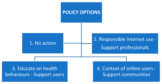 Regarding the policy options, the first one (i.e., no action) has also been put forward in similar preventive studies on substance use disorders. This action is based on the available knowledge on natural recovery, which is considered in the context of IGD as well [65]. However, as almost no follow-up studies have produced evidence on long-term relapse and the natural recovery rates, caution must be applied for this first policy option. The second policy option will aid informing and training professionals and practitioners and is aligned with the few international reviews on IA and prevention. For instance, according to Vondráčková and Gabrhelík [16], the improvement of skills in specific professions (i.e., for researchers, counsellors, and teachers) can support preventive action and better intervention plans or, as Kiraly et al. [57] stated, measures are taken to make health services available to gamers who experience problems. The third policy option, related to users, also highlights the need to pay attention to those who are among the highest risk groups, individuals of particular age (e.g., children and youth, especially MMORPG gamers), gender (males), engaged in a general or specific Internet activity, and who experience comorbidity [6,15,16,55,57,58,59]. The fourth policy option is aimed at supporting communities, including signposting families, schools, institutions, and governments [13,16,57,63,66,67].