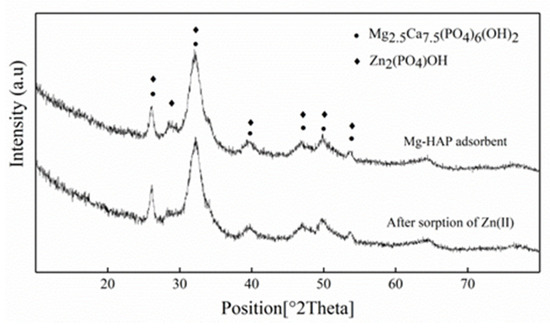 X-ray diffraction (XRD) patterns of magnesium hydroxyapatite (Mg-HAP) before and after Zn(II) sorption. Initial pH = 6.0; adsorbent dose = 0.25 g/50 mL, 25 °C.