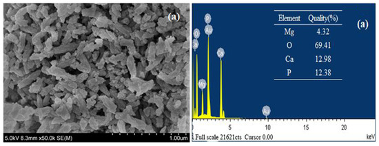 Scanning electron microscope (SEM) results for the Mg-HAP adsorbent and energy dispersive spectrum (EDS) analysis results for the Mg-HAP sorbent (a) before and (b) after Zn(II) sorption (initial concentration = 10 mg/L; initial pH = 6.0; sorbent dosage = 0.25 g/50 mL; 25 °C).