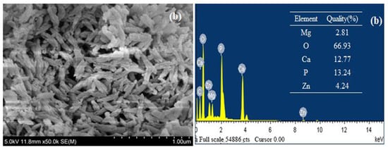 The micromorphology of Mg-HAP before and after zinc sorption can be clearly observed via SEM. When Mg-HAP was not adsorbed, its surface exhibited a rough, compact, and short-rod-like appearance (Figure 2a), and there was no change when the adsorption was completed. It was also observed that the void structure was more obvious so that Mg-HAP did not affect the crystal structure of the solid solution after adsorbing Zn(II), and this structure facilitated the adsorption of Zn(II) ions. Corresponding EDS analysis ascertained the presence of-Mg, O, Ca, P (Figure 2a) material samples. Au was introduced during the preparation, whereas Mg, O, Ca, P, and Zn (Figure 2a) elements were observed after adsorption. The elements in the HAP were present in the test results, and the Mg appeared at the same time, indicating that Mg had entered the HAP crystal lattice. According to related studies, Ca2+ in the HAP component can easily be displaced with some small radius ions [18]. However, the increase of the Mg-HAP-specific surface area is more conducive to the precipitation of Mg2+ and Ca2+ from the lattice of HAP [19]. In Figure 2a,b, the mass fractions of Mg and Ca decreased from 4.32% and 12.98% to 2.81% and 12.77%, respectively, and the mass fraction of Zn after the completion of adsorption was 4.24%, indicating that Zn(II) ion may exchange with Mg2+ and Ca2+ [20].