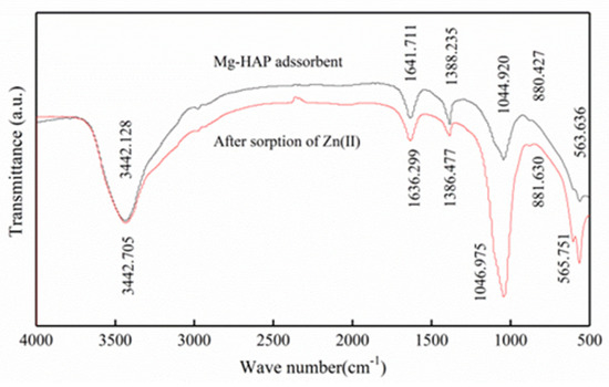 In order to observe the structure of Mg-HAP before and after the sorption of zinc (Figure 3), its surface features were analyzed via FTIR. FTIR analysis indicated that the P-O link bending mode of Mg-Hap was at 563.636 and 565.751 cm−1 [11]. The stretch mode of a phosphate group was at 1044.920, 1046.975 cm−1 [21]. The strip at 880.427 cm−1 was considered an asymmetric telescopic motion associated with the P-O bond [11]. Therefore, these analyses indicate the presence of a PO43− group. However, the band at 1641.711, 1636.299 cm−1 may have been an absorbed water molecule [22] and had a tensile mode of O-H bond at 3442.128, 3442.705 cm−1. Therefore, the tensile strength exhibited at 1044.920 and 1046.975 cm−1 may have been an increase in the strength of the PO43− absorption summit, indicating that PO43− participated in the chemical reaction during the adsorption process, possibly forming a phosphate complex with PO43− and Zn2+.