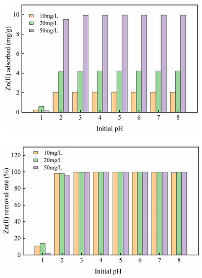 The pH of the solution is a significant parameter [23]. Zn(II) ions can form a hydroxide precipitate at the alkaline liquor. As a result, the pH gradient was selected to be 1.0−8.0. The adsorption result of Mg-HAP adsorbent on Zn(II) is shown in Figure 4. The elimination effect and sorption capacity of Mg-HAP for three different concentrations of Zn(II) solution exhibited similar trends. The results showed that Mg-HAP did not achieve the removal effect on Zn(II) at pH = 1. When the pH is 1.0~2.0, the sorption amount and elimination rate of the solution increased rapidly, which indicated that there were abundant sites closely related to cations on the skin layer of the sorbent and that it was conducive to sorption [24]. In particular, the adsorption amount at a concentration of 50 mg/g is 2−5 times higher than 10 and 20 mg/g. When the pH > 4.0, the removal rate of the aqueous solution could be maintained at about 99% and was relatively stable. This phenomenon occurred mainly because under the condition of a strong acid, H+ will compete with the Zn(II) in the solution for adsorption position, and it is easy to occupy the adsorption site, at which time Zn(II) can only remain in the solution. Under weak acid conditions, more adsorption sites were provided to Zn(II) at this time, which raised the effective contact area and the amount of zinc adsorption. The adsorption effect was the best at pH = 6. At this time, the removal rates of the three different concentrations of the solution were 99.84%, 99.87%, and 99.86%, respectively, and the adsorption amounts were 2.061, 4.236, and 9.958 mg/g, respectively.