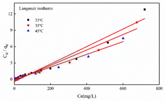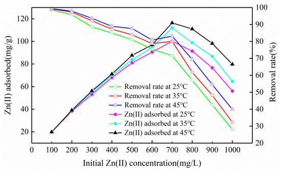 With a constant increase of zinc concentration, the slope of the curve formed by the adsorption amount was first positive and then negative, indicating that the adsorption amount first increased and then decreased (Figure 5). However, the slope of the removal rate was negative, indicating that it gradually decreased (Figure 5). This phenomenon occurred because the adsorbent surface sites were abundant at the initial stage, providing enough channels to adsorb a great quantity of Zn(II) ions [25]. When the concentration reached a certain level, the surface of the adsorbent was fully occupied by heavy metal ions, the adsorption amount reached a saturation state, and the adsorption amount and removal rate were reduced. At 25, 35, and 45 °C, the maximum sorption capacity of Mg-HAP for zinc was 100.20, 112.06, and 116.34 mg/g, respectively. The removal rate changed from 98.6% to 28.06%, from 99.11% to 32.36%, and from 99.37% to 39.90%. From the temperature point of view, the raised temperature led to a corresponding increase in the removal ratio and sorption amount, which may have occurred because the adsorbent surface activation and available active sites increased; thus, increasing the temperature could promote the adsorption of the aqueous solution containing Zn(II) [26].