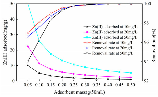 The sorbent dosage is a significant parameter that not only controls the optimal sorption capacity but also more accurately expresses the sorption effect. As the dosage of sorbent increased by degrees, the removal rates of three different concentrations of Zn(II) solution first increased and then stabilized (Figure 6). The quality of sorbent used in the experiment increased from 0.05 g to 0.50 g, and the elimination rate increased from 96.98%, 96.60%, and 94.02% to 99.97%, 99.99%, and 99.99%, respectively. The adsorption amount generally showed a downward trend, and the declining trend was faster at 0.05~0.15 g; The trend was relatively flat at 0.15~0.50 g. The adsorption amounts decreased from 10.009, 23.422, and 50.227 mg/g to 1.031, 2.320, and 5.341 mg/g, respectively. This was mainly due to the augmented dose of the sorbent and the enlarged surface area of the sorption, which raised the sorption position for the zinc ions and increased the adsorption capacity for metal ions. When the dosage increases to a certain point, more adsorption sites will be added, and the adsorption residual phenomenon will occur, thus reducing the adsorption capacity [27]. The experimental process used a sorbent dose of 0.25 g/50 mL; the removal rates of 10, 20, and 50 mg/g Zn(II)-containing aqueous solutions were 99.75%, 99.78%, and 99.82%, respectively. Therefore, considering factors such as adsorption and economic effect, the preferred dosage was 0.25 g/50 mL.
