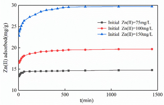 Contact time is a major parameter. The reaction was divided into a rapid adsorption phase and an adsorption equilibrium phase (Figure 7). In the rapid phase, for the adsorption with the initial Zn(II) concentration of 75, 100, and 150 mg/L increased continuously within 120, 340, and 560 min, respectively. This phenomenon indicated that the Mg-HAP sorbent provided abundant sorption sites for Zn(II) at the beginning, which could rapidly replace the position of H+ in HPO42− to form surface complexes. In the equilibrium phase, the adsorption basically reached the saturation state and replaced the process of ion exchange between some calcium ions and magnesium ions, the scale of sorption sites lessened and the activity decreased, and the activity ultimately reduced the reaction rate [28]. However, at pH = 6, the initial concentration of zinc was 75 mg/L, the Mg-HAP could withstand the ultimate adsorption capacity of Zn(II) within 120 min, the sorption efficiency reached 0.1205 mg/(g·min), and the total amount of adsorbed Zn(II) reached 97.28%. Similarly, when the Zn(II)-containing liquor was 100 and 150 mg/L, respectively, over 95% of zinc was adsorbed in 300 min, and the sorption efficiency reached 0.0638 and 0.0962 mg/(g·min).