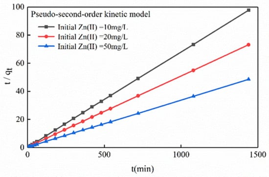 The fitting correlation coefficients R2 at an initial experiment concentration of 10, 20, and 50 mg/L were 1.0000, 1.0000, and 0.9999, respectively, reaching a significant correlation. Therefore, the pseudo-second-order dynamics were better able to tally with the sorption process of zinc by Mg-HAP adsorbent. Table 2 shows that the K2 and h figures were 0.1822−0.2770 and 39.6399−206.0935 g/(mg·min), respectively. The calculated theoretical equilibrium sorption amounts were 14.75, 19.72, and 29.85 mg/g, respectively, which tallied with the practical outcomes of 14.74, 19.69, and 29.68 mg/g. Therefore, it can be speculated that the process of Mg-HAP sorption of zinc is mainly based on the effect of chemical reaction [30]. The fitting R2 value of the Elovich equation (Table S1) was highly consistent with the pseudo-second-order kinetic fitting R2 value, which further indicates that there may have been an ion exchange between Mg-HAP and Zn(II).