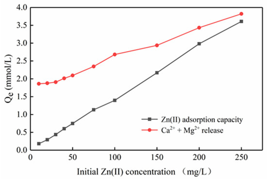 Zn(II) adsorption and Ca2+, Mg2+ release under different Zn(II) concentrations.