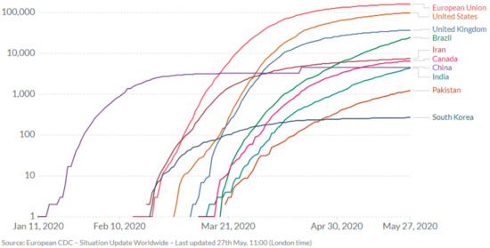 - Roser, M.; Ritchie, H.; Ortiz-Ospina, E.; Hasell, J. Coronavirus (COVID-19) Deaths. Available online: https://ourworldindata.org/covid-deaths (accessed on 27 May 2020).