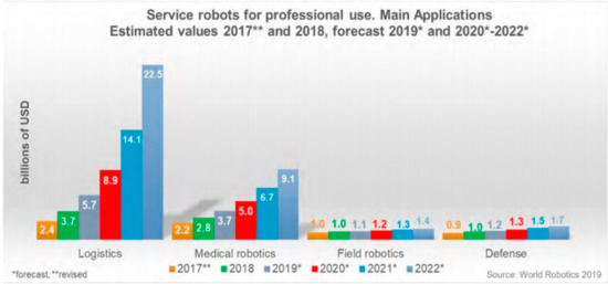 The applications of robotics and automation in healthcare and allied areas is increasing day by day [8,9]. The International Federation of Robots (IFR) predicts an ever-increasing trend in the demand of medical robots within the coming years with an estimation of 9.1 billion USD market by 2022 as shown in Figure 3. Robots not only help physicians and medical staff to carry out complex and precise tasks but also lower their workload thus improving the efficiency of the overall healthcare facilities [10].