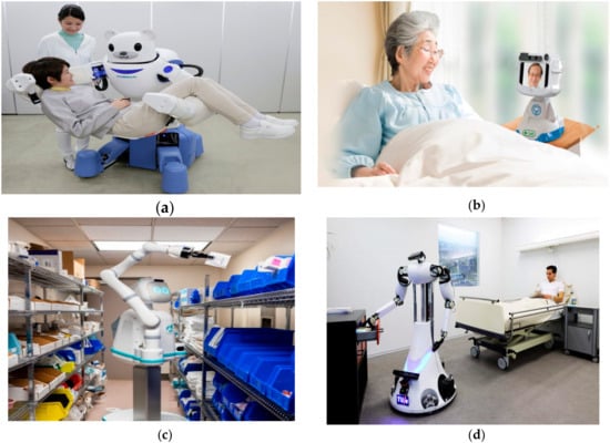 Nursing robots in hospital and at home for elderly care. (a) Robear—a robotic bear nurse to lift patients in Japan [33]. (b) Dinsow robot for elderly entertainment and face-to-face calls [34]. (c) Moxi—Nursing robot placing medicines in bins [35]. (d) Robot attendant for hospital care [36].