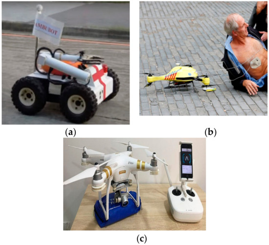Ambulance robots. (a) Ambubot [39]. (b) Automated External Defibrillator (AED) for patient recovery [40]. (c) Drone carrying a first aid kit (blue) controlled by a smart phone [41].