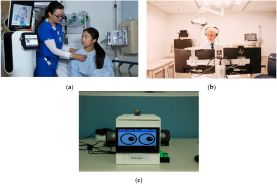 Figure 7a shows RP-VITA (MedTech Boston, MA, USA), which is the first FDA-approved autonomous telemedicine robot. A doctor in a remote location can address the patients using real time audiovisual tele-conferencing as shown in Figure 7b. A telemedicine robot in Figure 7c is used for low-cost remote interface with the patients for diagnosis of ailments.