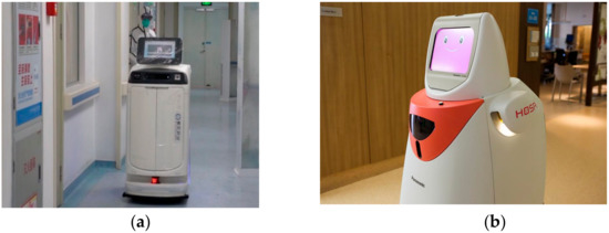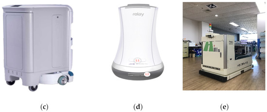Indoor serving robots in hospitals. (a) Chinese hospitals using robots to deliver medicines in a patient’s room [48]. (b) Panasonic Autonomous Delivery Robots—HOSPI—deployed in a hospital in Singapore [49]. (c) TUG autonomous service robot [50]. (d) RELAY robot to deliver medicine [51]. (e) LoRobot L1 [52].