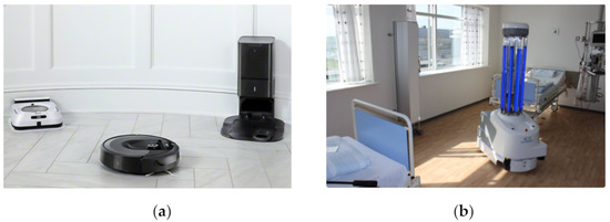 Cleaning and mopping robots in hospitals. (a) Roomba i7 cleaning robot [54]. (b) UVD robot for disinfecting hospital premises [55]. (c) Peanut robot for washroom cleaning [56]. (d) Swingobot 2000 cleaning robot [57].