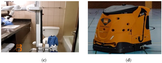 Many such systems are depicted in Figure 9. Roomba cleaning robot (iRobot, Bedford, MA, USA) is an intelligent navigating vacuum pump for dry/wet mopping as shown in Figure 9a. UVD robot (UVD Robots ApS, Odense, Denmark) is a ultra-violet radiation based device used to disinfect hospital premises from microbes as presented in Figure 9b. Peanut robot (San Francisco, USA) in Figure 9c is used to clean washrooms of hospitals by using a highly dynamic robotic gripper and sensing system. Swingobot 2000 (TASKI, South Carolina, USA) is a heavy-duty cleaning robot for cleaning hospital floors autonomously as shown in Figure 9d.