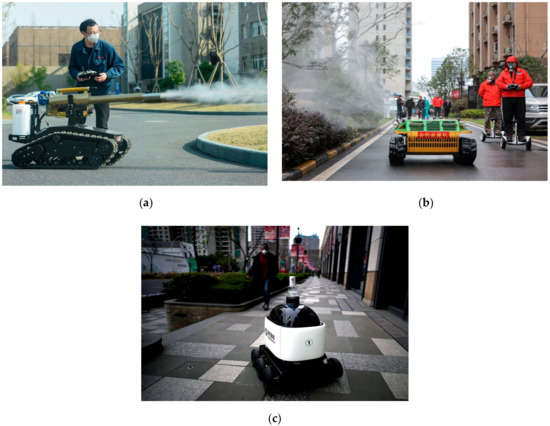 Spraying and sanitizing robots in residential areas of China [58]. (a) Remote control disinfecting mobile robot in Hangzhou, China. (b) Spraying robots to disinfect large residential areas in China. (c) A hand sanitizer-dispensing robot in Shanghai.