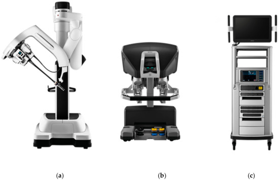Da Vinci robotic surgical system [60]. (a) Patient cart. (b) Surgeon console. (c) Vision cart.