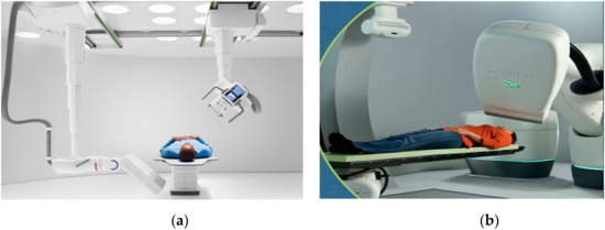 Specialized robots for spine and cranial biopsy and surgery. (a) Multitom Rax: Twin Robotic X-ray from Siemens Healthineers [65]. (b) Cyberknife: Radiology Oncology Surgical robot [66].