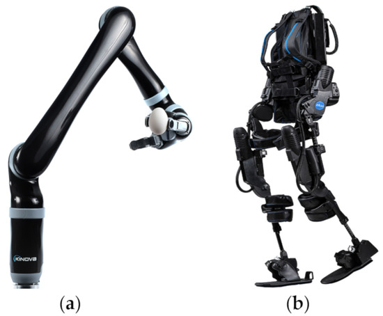 Rehabilitation and assistive robots. (a) Kinova assistive robotic arm [69]. (b) EksoNR exoskeleton [70].