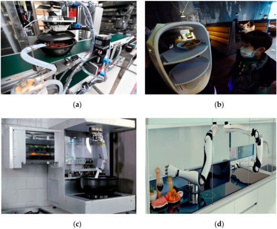 Food robots in a hospital’s kitchen for preparing and delivery. (a) Robot chef in a Chinese hospital [58]. (b) Food delivery robot in hospital [58]. (c) Cooki robot to prepare meals [71]. (d) Moley—World’s first robotic kitchen [72].