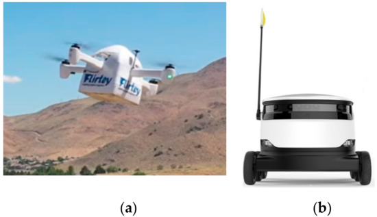 Outdoor delivery robots (ground based and aerial systems). (a) Flirtey drone robot for delivery of medicine/blood sample/food [73]. (b) Starship autonomous delivery robot [74].