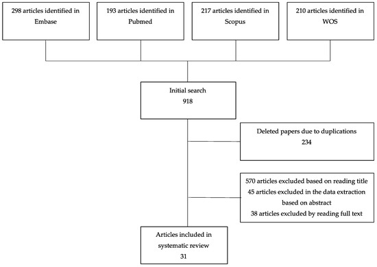 A total of 918 articles were found in the databases consulted, and 31 articles that satisfied the inclusion criteria were finally included in the study (Figure 1).