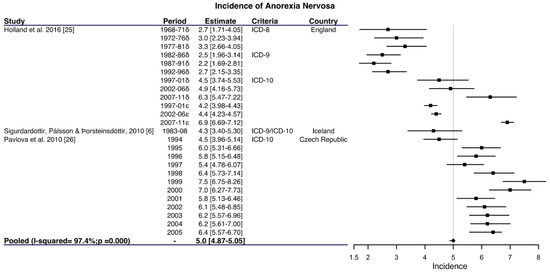Three cohort studies were found in which the incidence of AN ranged between 120.0 and 318.9 cases per 100,000 women–years (Table S5) and showed some differences in the sample profiles and the screening and diagnosis procedures. Thus, the study by Keski-Rakhonen et al. 2007 [51] administered a screening questionnaire to twin women and made a diagnosis using the structured clinical interview for DSM-IV (SCID) [52], while in the study by Ghaderi and Scott, 1998 [53], a screening questionnaire was also administered to the sample, though they did not specify whether the diagnosis was carried out by a doctor. Lastly, in the study from Lahortiga-Ramos et al. 2005 [54], a screening questionnaire was administered to young women and the diagnosis was done by a psychiatrist.