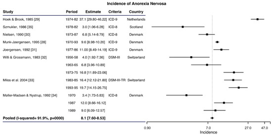 In Tables S3 and S4, we can also see how most of the articles analyzed use the ICD and DSM classifications, showing great variability in the incidence rates of AN depending on the classification used: DSM-III (4.0–75.5), DSM-IV (3.4–66.1), ICD-8 (1.7–12.0), ICD-9 (2.0–7.1) and ICD-10 (4.2–101.0).