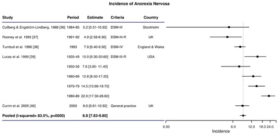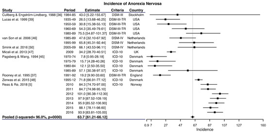 This heterogeneity makes it difficult to know the actual incidence of AN and its trend over time. The aim of this review was thus to systematically review and perform a meta-analysis of the literature on the incidence of AN in women published between the period 1980 and 2019, especially in young women, taking into account the different methodological approaches that can be used.