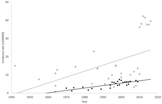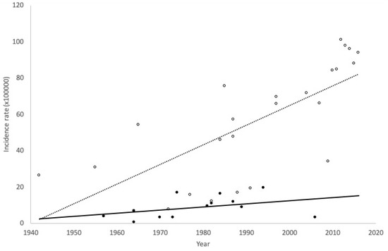 Finally, we calculated the linear trends in women of all ages and young women based on HA and OHS records, from 1940 until now. When incidences were reported for a range of years, the center of the interval was considered as the reference year for the trend calculation.