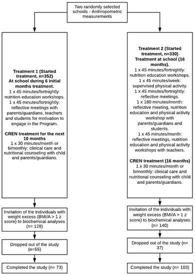 This study was conducted in two public schools in the city of São Paulo, Brazil. Three schools were eligible, and two of them were randomly selected to receive Treatment 1 or 2 (Figure 1). First, the weight and height of male and female children aged 8–11 years were measured to identify which children were overweight or obese (BMI/A ≥ 1 Z score and normal height for age (HAZ > −2)) in the two schools. Results of anthropometric assessment at School 1 (Treatment 1) showed that 36% of children had weight excess, of whom 20% were overweight and 16% were obese. In School 2 (Treatment 2), 42% of children had weight excess, of whom 25% were overweight and 17% were obese. At this time, no biochemical examination was performed, and the treatment was applied in all children who participated in the classroom activities. All overweight/obese children who were eligible for the study underwent blood collection and biochemical analyses in their respective schools (Figure 1).
