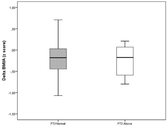 Delta of BMI/A (z score) based on the FT3 values at follow-up. The line represents the median (interquartile interval). Mann–Whitney test, p = 0.723.