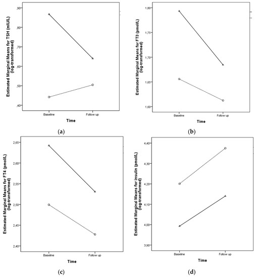 Blood samples were obtained after a 10-h night fast to measure the glucose, insulin, TSH, FT4, and FT3 levels. These assays were performed by chemiluminescence in the Research Incentive Fund Association (AFIP, in Portuguese). The normal values were 0.34−6.0 mIU/L for TSH, 6.95−20.59 pmol/L for FT4, and 3.84−5.97 pmol/L for FT3. The homeostasis model assessment (HOMA-IR) was performed to measure insulin resistance using the following formula [21]: HOMA-IR = fasting insulin (mU/L) × fasting glucose (mmol/L)/22.5. Blood samples were collected at the beginning of the study and after 16 months.