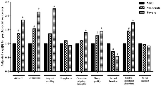 Influence of chronic fatigue on psychosocial status in Spanish women with endometriosis. Results from multivariate linear regression analyses adjusted for age (years), schooling, civil status, number of surgeries, type of diagnosis, time since diagnosis, number of children, premenstrual symptom severity and last week pelvic pain intensity. # p-value ≤ 0.05 between mild and moderate groups; * p-value ≤ 0.05 between mild and severe groups.