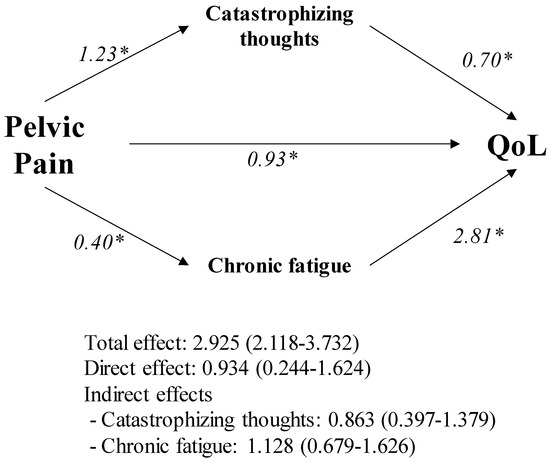 Mediating effect of chronic fatigue and catastrophizing thoughts on the association between pelvic pain and quality of life (QoL) in Spanish women with endometriosis. * Mediating effects were considered significant when zero was not located within the confidence intervals. Analyses were conducted with the macro PROCESS for SPSS.