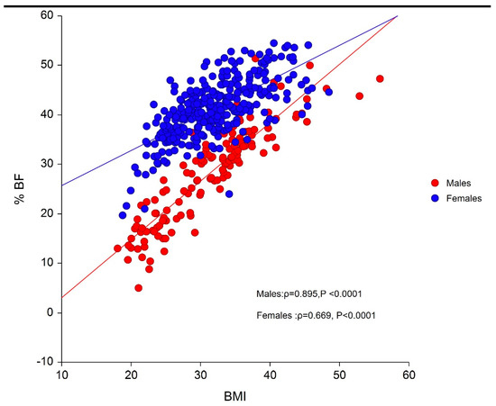 Figure 1 shows a strong association between BMI and BF% in males (ρ = 0.895; p < 0.0001) and females (ρ = 0.669; p < 0.0001); however, for a determined BMI, a wide range of BF% values are evident in both genders.