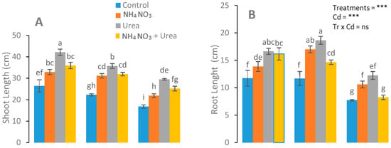 It is an established fact that fertilizer application generally has positive effects on plant growth under heavy metal toxicity [,]. In the present study, the highest plant growth was observed in the urea-treated plants at 25 mg kg−1 Cd concentrations, in contrast to the NH4NO3-treated plants (Figure 1). The findings of our study are in accordance with the finding of Lin et al. [], who found that 2.5 mmol N L−1 was the optimal concentration to boost S. alfredii shoot growth. Moreover, 1.0 mmol N L−1 was found to be an optimal concentration for Cd and Zn storage in the shoots of S. alfredii. Furthermore, stunted plant growth under heavy metal stress was noticed. For example, Rabelo et al. [] reported that 2.0 mM Cd in Tanzania guinea grass inhibited the production of new tillers and leaves. A reduced nitrate uptake from the nutrient solution was reported by Gouia et al. [] for Cd-exposed plants. It was investigated that the Cd concentration increased in S. nigrum with a supply of N-fertilizer (NH4NO3) without affecting the Cd speciation in plants []. Wei et al. [] confirmed that the accretion of Cd in S. nigrum shoots and roots is augmented by applying urea in the growth medium. In our study, the root and shoot dry weights, shoot length, numbers of leaves per plant, and roots length of S. nigrum plants were significantly enhanced with the N-fertilizer application. In our current study, disparity in the Cd absorption in differently treated plants was observed, which is in line with the results of Ye et al. [], who described an enhanced absorption of Cd and a phytoextraction efficiency of T. patula after N-fertilizer treatment. Moreover, our results are also supported by Yang et al. [].
