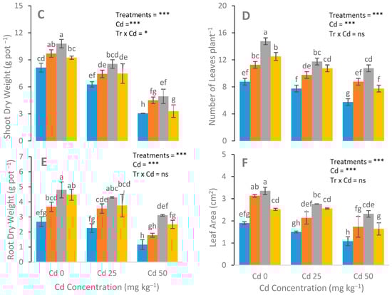 Around 70% of the dietary intake of Cd occurs from consuming the vegetables and grain crops grown in Cd-contaminated soils []. Cadmium is highly toxic for plant growth and seed germination, in addition to the antioxidant, photosynthetic, and enzyme activities []. It also causes visual toxicity symptoms including a reduction in plant height, necrosis, and leaf chlorosis []. Excessive concentration of Cd also impairs the uptake of some integral nutrients, such as iron, zinc, and manganese []. Increased electrolyte leakage (EL), malondialdehyde (MDA) content, and oxidative stress in plants, along with a reduced enzyme activity, are also evident in Cd-affected plants []. Therefore, it is imperative to control Cd pollution so as to minimize the Cd concentrations in the soil, as well as to reduce its uptake by plants, especially in the edible portions of plants []. Phytoremediation is a useful technique to cope with the heavy metals problem, through use of green plants to remove/degrade pollutants from the contaminated soils. Phytoremediation is considered an attractive substitute for soil remediation, because it is one of the cheapest and most ecofriendly methods compared with other techniques [].